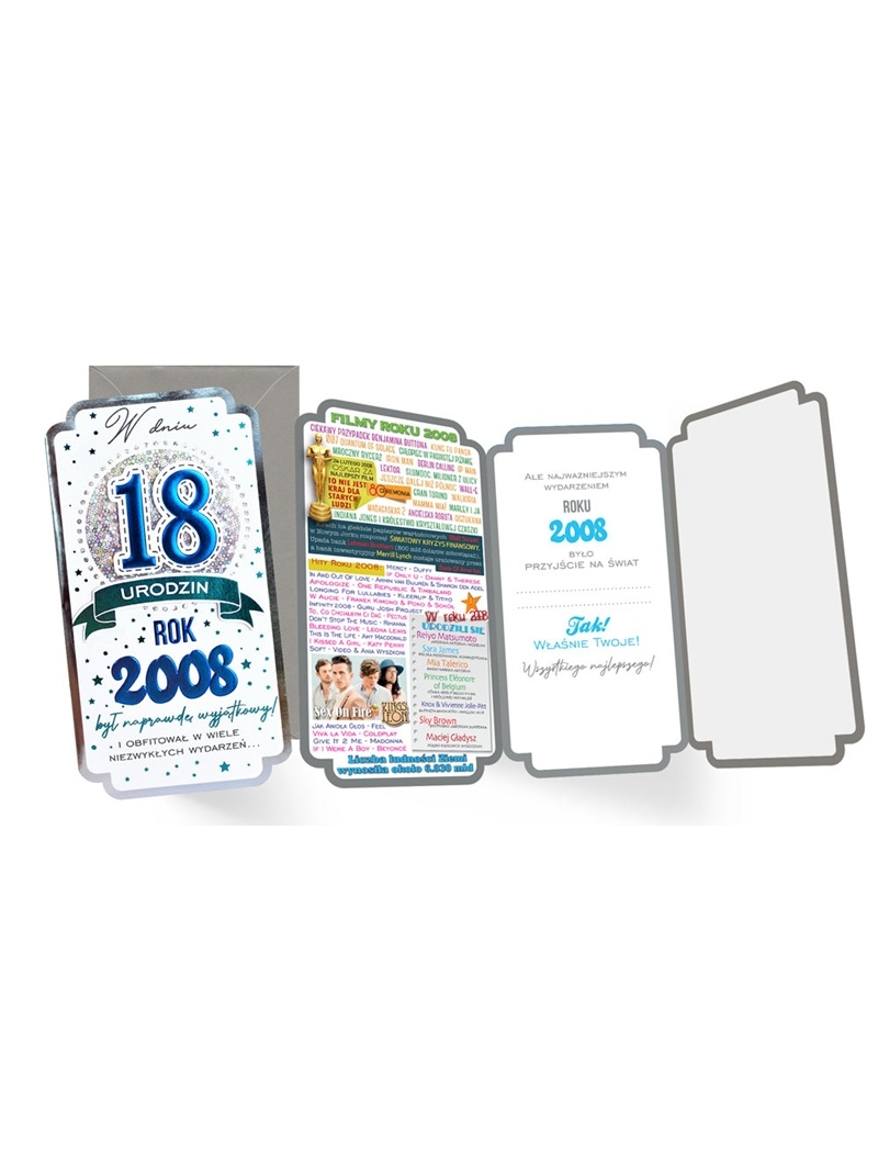 Kartki urodzinowe z serii "Roczniki" to ciekawa opcja karnetu wysyłanego z okazji osiągnięcia pełnoletności. Karnet na 18 Urodziny z naklejoną na piance dystansowej dużą liczbą 18 w kolorze niebieskim. Tematyka kartek z reguły zabarwiona szczyptą humoru nawiązuje do wydarzeń sprzed 18 lat - w 2008 roku.