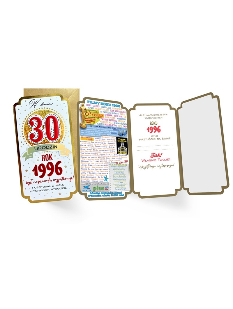 Kartki urodzinowe z serii "Roczniki" to ciekawa opcja karnetu wysyłanego z okazji "okrągłych" rocznic jubilatów. Karnet na 30 Urodziny z naklejoną na piance dystansowej dużą liczbą 30. Liczba ozdobiona jest czerwonym brokatem. Tematyka kartek z reguły zabarwiona szczyptą humoru nawiązuje do wydarzeń sprzed 30 lat - w roku 1996.