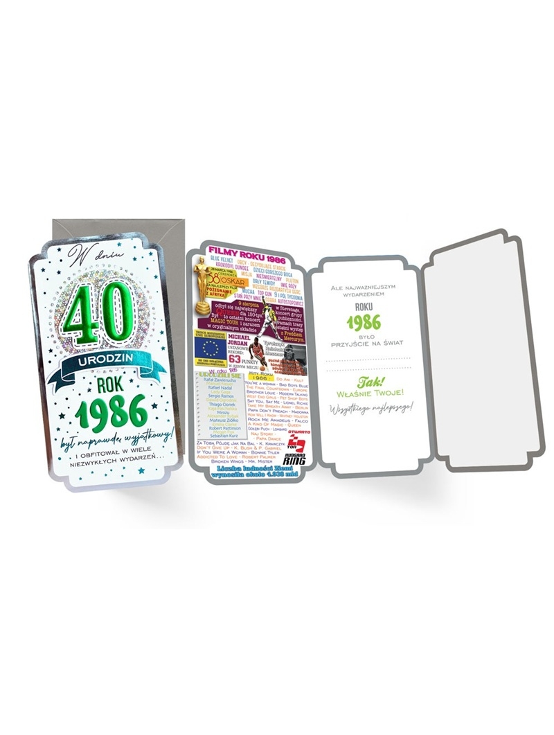 Kartki urodzinowe z serii "Roczniki" to ciekawa opcja karnetu wysyłanego z okazji "okrągłych" rocznic jubilatów. Karnet na 40 Urodziny z naklejoną na piance dystansowej dużą liczbą 40. Liczba ozdobiona jest zielonym brokatem. Tematyka kartek z reguły zabarwiona szczyptą humoru nawiązuje do wydarzeń sprzed 40 lat - w 1986 roku.