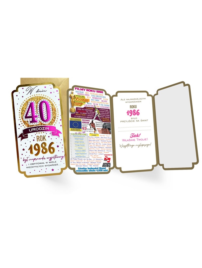 Kartki urodzinowe z serii "Roczniki" to ciekawa opcja karnetu wysyłanego z okazji "okrągłych" rocznic jubilatów. Karnet na 40 Urodziny z naklejoną na piance dystansowej dużą liczbą 40. Liczba ozdobiona jest różowym brokatem. Tematyka kartek z reguły zabarwiona szczyptą humoru nawiązuje do wydarzeń sprzed 40 lat - w 1985 roku.