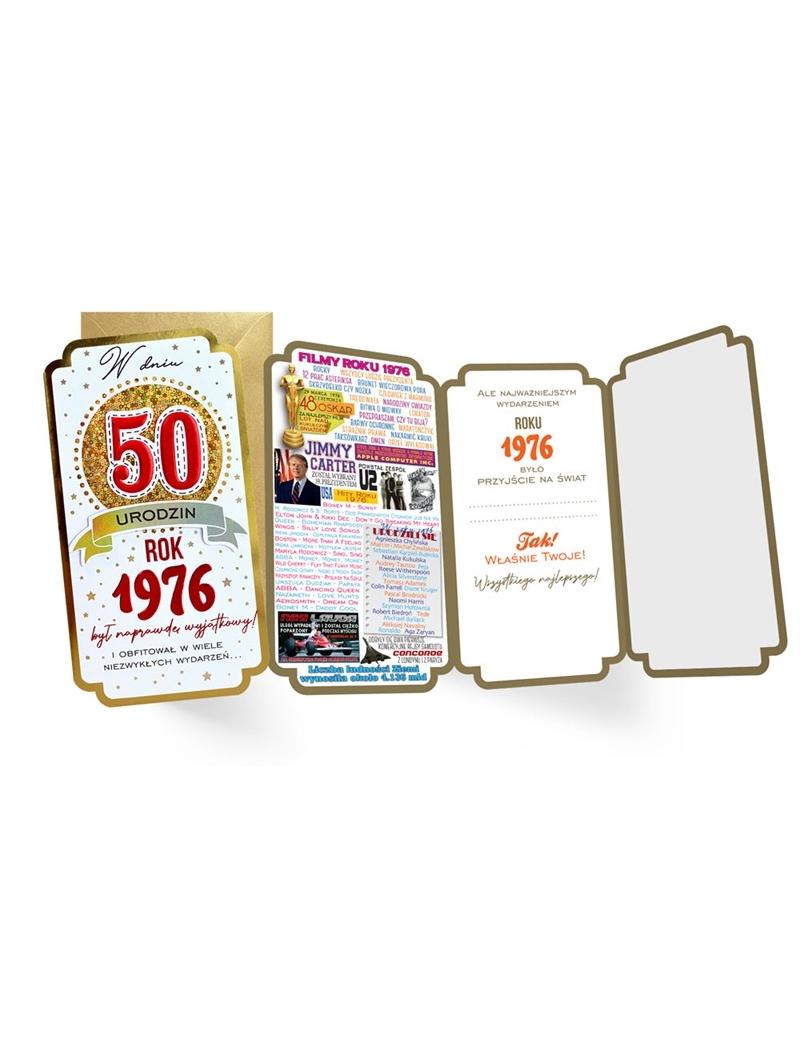 Kartki urodzinowe z serii "Roczniki" to ciekawa opcja karnetu wysyłanego z okazji "okrągłych" urodzin. Karnet na 50 Urodziny z naklejoną na piance dystansowej dużą liczbą 50. Liczba ozdobiona jest czerwonym brokatem. Tematyka kartek z reguły zabarwiona szczyptą humoru nawiązuje do wydarzeń sprzed 50 lat - w 1976 roku.