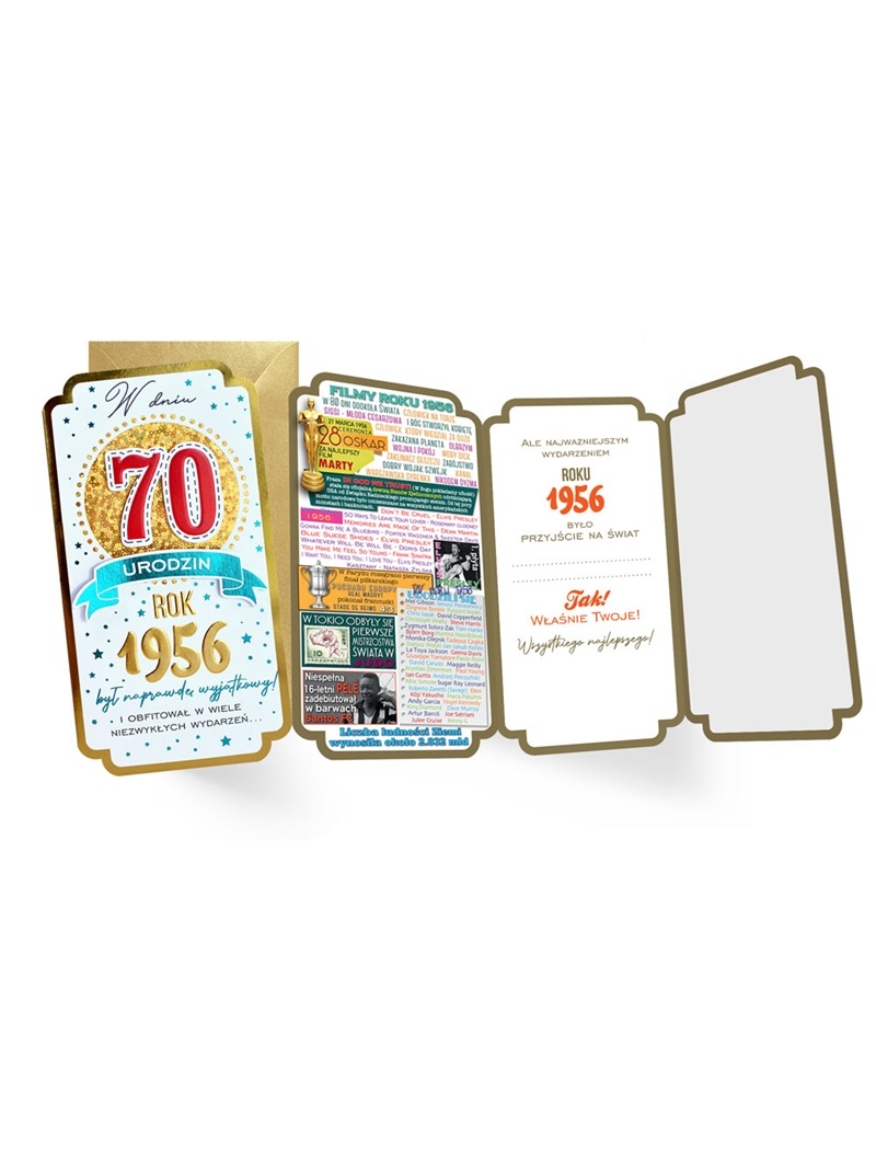 Kartki urodzinowe z serii "Roczniki" to ciekawa opcja karnetu wysyłanego z okazji "okrągłych" rocznic jubilatów. Karnet na 70 Urodziny z naklejoną na piance dystansowej dużą liczbą 70. Liczba ozdobiona jest czerwonym brokatem. Tematyka kartek z reguły zabarwiona szczyptą humoru nawiązuje do wydarzeń sprzed 70 lat - do roku 1956.