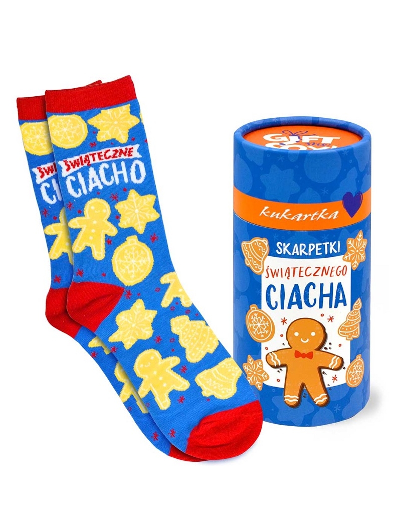 Skarpetki "Gift me sox" z napisem - "ŚWIĄTECZNE CIACHO" to świąteczne skarpetki unisex – to miękkie i ciepłe skarpetki idealne na zimowe dni. Takie skarpetki zapewniają komfort cieplny w chłodne dni. Skarpetki zapakowane są w ładna tubę i stanowią idealny prezent od Mikołaja lub pod choinkę. Skarpetki wykonane są z wysokiej jakości materiałów. Takie skarpetki to idealny świąteczny prezent dla każdego zmarźlucha. Rozmiar uniwersalny pasujący na prawie każdą stopę.