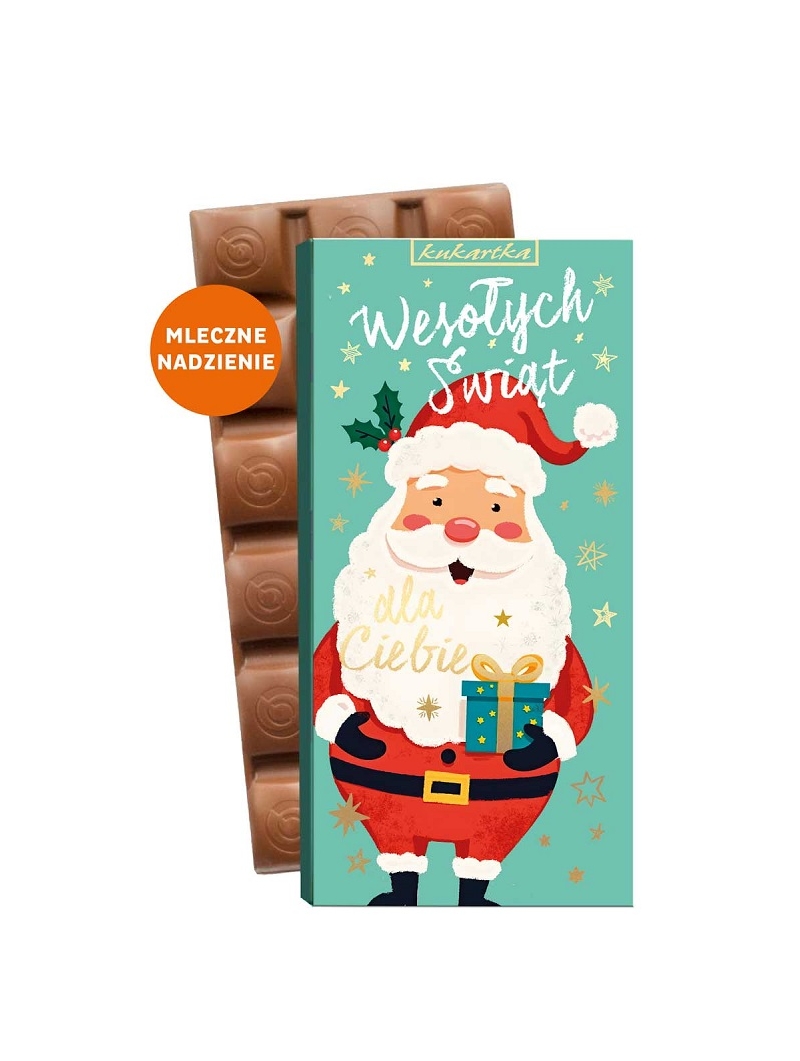 Czekolada prezentowa - "Wesołych Świąt dla Ciebie" to pyszna polska mleczna czekolada z delikatnym mlecznym nadzieniem. Czekolada mleczna z nadzieniem o smaku mlecznym (50 %). Czekolada zapakowana jest w eleganckie świąteczne opakowanie.