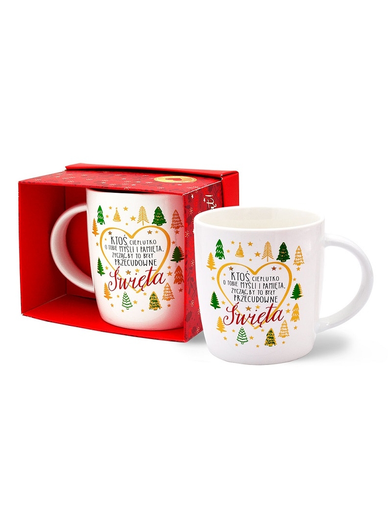 Z okazji świąt podaruj komuś z najlepszymi życzeniami wyjątkowy kubek na pyszną herbatkę. Kubek o ładnym kształcie i wygodnym uchwycie został wykonany z ceramiki w kolorze białym. Na kubku i herbacie znajduje się napis - "KTOŚ CIEPLUTKO O TOBIE MYŚLI I PAMIĘTA, ŻYCZĄC, BY TO BYŁY PRZECUDOWNE Święta". Kubek zapakowany jest w kolorowe pudełko - idealnie do podarowania na prezent.