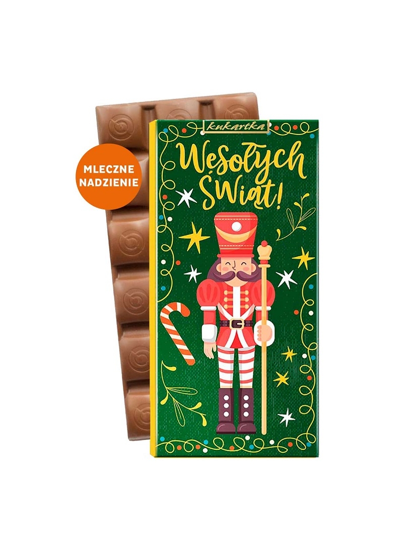 Czekolada prezentowa "Wesołych świąt" to pyszna polska mleczna czekolada z delikatnym mlecznym nadzieniem. Czekolada mleczna z nadzieniem o smaku mlecznym (50 %). Czekolada zapakowana jest w eleganckie świąteczne opakowanie.