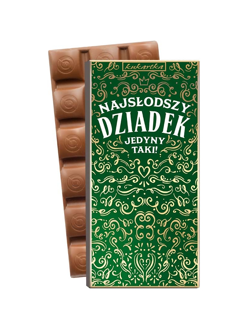 Czekolada to zawsze trafiony prezent dla "Najsłodszego DZIADKA". To słodycz, której Dziadek się nie oprze. Bo kto nie lubi czekolady? Dlatego właśnie będzie to idealny prezent dla każdego Dziadka, bez wyjątku. Podaruj Dziadkowi słodycz zamkniętą w niebanalnym opakowaniu. Wybierz czekoladę, która jest zdecydowanie wyjątkowym upominkiem nie tylko na "Dzień Dziadka". SKŁADNIKI: cukier, tłuszcz kakaowy, miazga kakaowa, mleko w proszku pełne, mleko w proszku odtłuszczone, tłuszcz roślinny, serwatka w proszku (z mleka), emulgatory: lecytyny (z soi) i E 476, aromat (wanilia). Masa kakaowa minimum 30%. Oprócz tłuszczu kakaowego zawiera tłuszcze roślinne. Zawiera mleko i soję. Może zawierać gluten, orzechy arachidowe i inne orzechy Przechowywać w suchym i chłodnym miejscu.