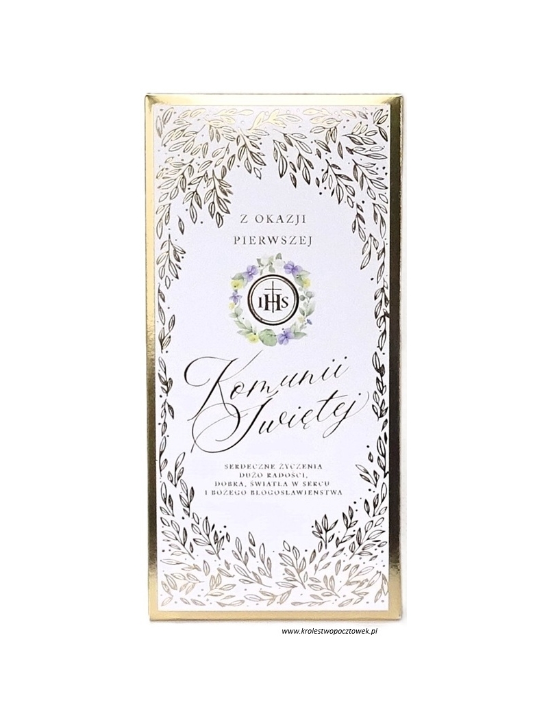 Super gadżet - czekolada na Pierwszą Komunię Świętą, bo które dziecko nie lubi czekolady! Smaczna czekolada mleczna z delikatnym mlecznym nadzieniem, w eleganckim opakowaniu z motywem komunijnym. Składniki: czekolada mleczna 50% [cukier, tłuszcz kakaowy, miazga kakaowa, mleko w proszku pełne, mleko w proszku odtłuszczone, serwatka w proszku (z mleka), tłuszcz mleczny, emulgatory: lecytyny (z soi), ekstrakt z wanilii]. Nadzienie o smaku mlecznym 50% [cukier, tłuszcz roślinny (palmowy) serwatka w proszku (z mleka), mleko w proszku odtłuszczone 4,8%emulgator lecytyny: ekstrakt z wanilii, aromat)]. Czekolada mleczna: masa kakaowa min 30%. Produkt może zawierać zboża zawierające gluten, orzeszki arachidowe i orzechy. Wymiary: 17,0cmx8,0cmx1,0cm.