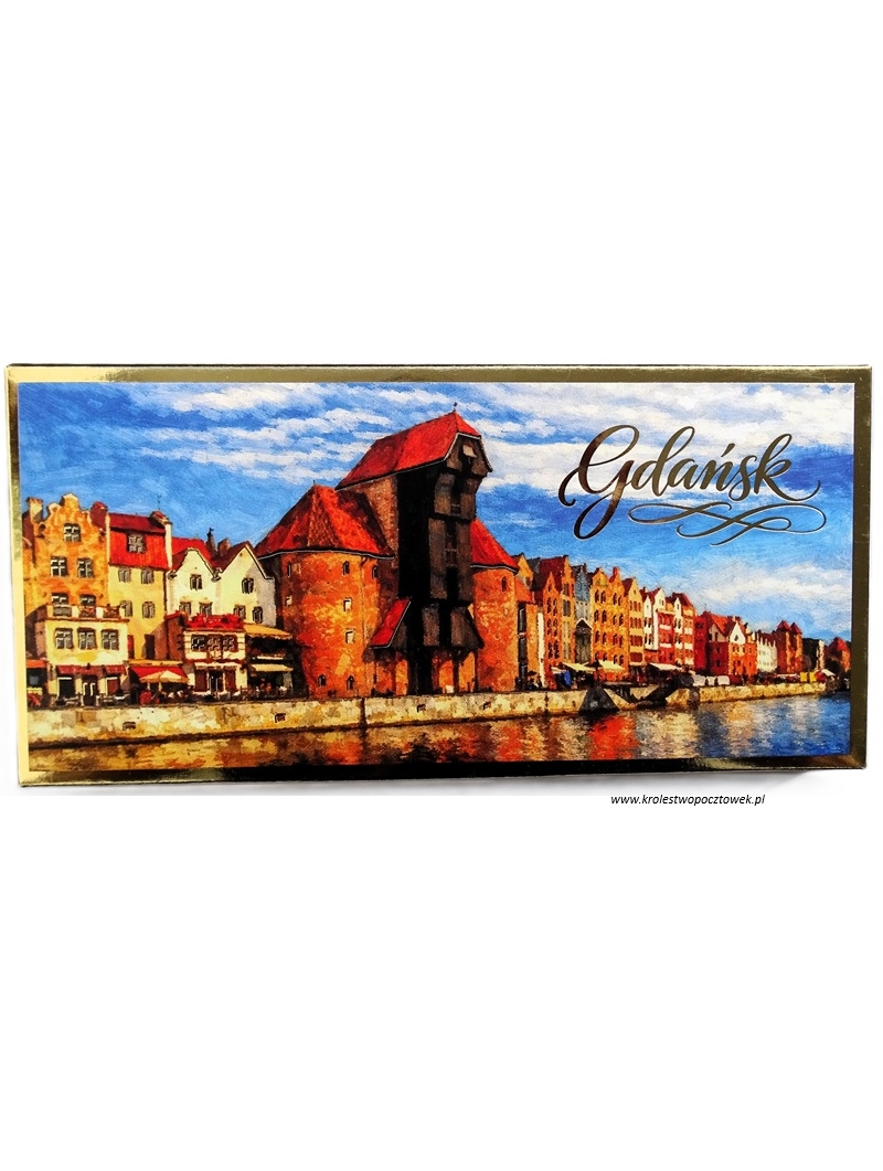 Super gadżet - czekolada upominek z Gdańska. Smaczna czekolada mleczna z delikatnym mlecznym nadzieniem, w eleganckim opakowaniu ze zdjęciem Długiego Pobrzeża w Gdańsku. Składniki: czekolada mleczna 50% [cukier, tłuszcz kakaowy, miazga kakaowa, mleko w proszku pełne, mleko w proszku odtłuszczone, serwatka w proszku (z mleka), tłuszcz mleczny, emulgatory: lecytyny (z soi), ekstrakt z wanilii]. Nadzienie o smaku mlecznym 50% [cukier, tłuszcz roślinny (palmowy) serwatka w proszku (z mleka), mleko w proszku odtłuszczone 4,8%emulgator lecytyny: ekstrakt z wanilii, aromat)]. Czekolada mleczna: masa kakaowa min 30%. Produkt może zawierać zboża zawierające gluten, orzeszki arachidowe i orzechy. Wymiary: 17,0cmx8,0cmx1,0cm.