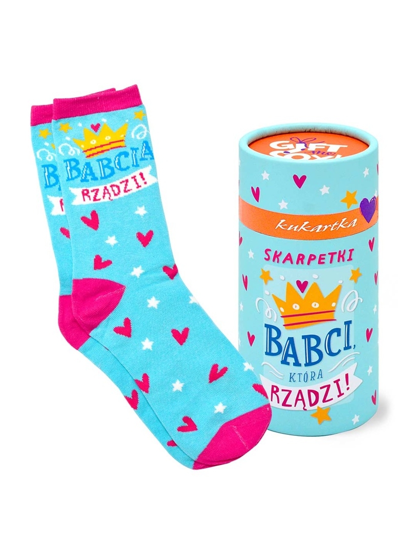 Skarpetki "Gift me sox" z napisem - "SKARPETKI DLA BABCI, KTÓRA RZĄDZI" to miękkie i ciepłe skarpetki idealne na zimowe dni. Takie skarpetki zapewniają komfort cieplny w chłodne dni. Skarpetki zapakowane są w ładna tubę i stanowią idealny prezent dla Babci. Skarpetki wykonane są z wysokiej jakości materiałów. Rozmiar uniwersalny.