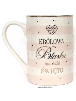 Która Kobieta nie lubi zaczynać dnia od porannej, aromatycznej kawy lub herbaty w eleganckim, ulubionym kubku. Ten wyjątkowy kubek sprawi, że kawa lub herbata będą smakowały wyjątkowo. Poręczny uchwyt umożliwi wygodne delektowanie się nią w chwilach relaksu. A napis na kubku - "KRÓLOWA Blasku ma dziś ŚWIĘTO" sprawi, że od razu poprawi się humor obdarowanej nim osoby i nabierze ona chęci do działania. Dodatkową ozdoba kubka jest naklejone z jednej strony serduszko z błyszczących cyrkonii. Kubek wykonany jest z wysoko gatunkowej ceramiki i zapakowany jest w ładny kartonik. Kubka nie można myć w zmywarce.