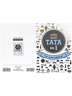 Kolorowy karnet z życzeniami z okazji Dnia Taty. Karnet wykonany z lakierowanego papieru.