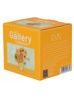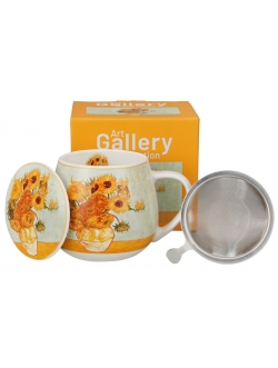 Kubek baryłka z zaparzaczem i pokrywką SŁONECZNIKI - Vincenta van Gogh'a wchodzący w skład serii Art Gallery, wykonany z porcelany New Bone China, charakteryzującej się naturalnym kremowo-białym kolorem z delikatnym połyskiem oraz wyjątkową wytrzymałością i trwałością, zachowując lekkość i finezję. Linia zdobiona motywem z obrazu SŁONECZNIKI van Gogha. Delikatna i nienachalna kolorystyka zdecydowanie wyróżnia kolekcję. Doskonały zestaw do przyrządzania ulubionej herbaty i aromatycznych ziół. Całość zapakowana w ozdobne pudełko dekorowane tym samym motywem. Ten zestaw to doskonały pomysł na niebanalny prezent pod choinkę, urodzinowy, a także podarunek jako podziękowanie. Zestaw można myć w zmywarce lub używać w mikrofalówce.