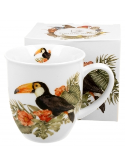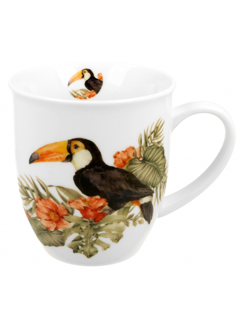 Kubek z linii "ANIMALS" kolekcja Ptasi Świat - TUKAN wykonany jest z porcelany New Bone China. Porcelana ta charakteryzuje się naturalnym kremowo-białym kolorem z delikatnym połyskiem oraz wyjątkową wytrzymałością i trwałością. Kubek zdobiony motywem tukana siedzącego w egzotycznych kwiatach. Całość zapakowana jest w ozdobne pudełko dekorowane tym samym motywem co na kubku. Taki kubek to doskonały pomysł na niebanalny prezent urodzinowy i świąteczny, a także podarunek jako podziękowanie. Kubek będzie również ozdobą każdej kuchni. Kubek można myć w zmywarce oraz używać w mikrofalówce.