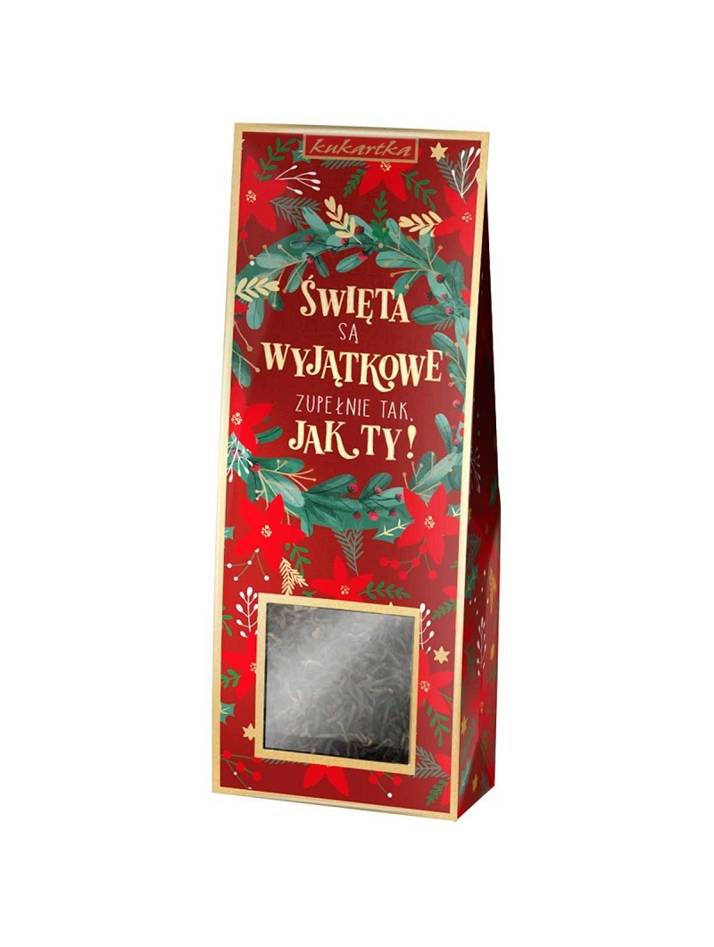 Elegancko zapakowana herbatka to świetny pomysł jeżeli szukamy małego ale eleganckiego prezentu. Herbatka opakowana jest w ładny kartonik z napisem. Z każdym łykiem tej owocowej herbaty o cudownym goździkowo - cynamonowym aromacie, poczujesz niezwykłą atmosferę świątecznego wieczoru. Wzbogacona owocami jabłka i aronii, okraszona rodzynkami i płatkami hibiskusa zaprasza aby się nią rozkoszować i poczuć cudowną, leniwą atmosferę Świąt.