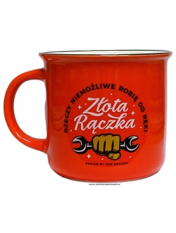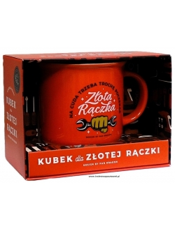 Ekskluzywny kubek dla każdego Pana - "Złotej Rączki". Kubek o ładnym kształcie wykonany z ceramiki. Kubek z zewnątrz jest w kolorze czerwonym w środku bardzo jasnym kremowym. Na kubku z obu stron znajduje się napis: "NA CUDA TRZEBA TROCHĘ POCZEKAĆ ZŁOTA RĄCZKA". Kubek zapakowany jest w ładny kartonik. Taki kubek to super prezent dla każdej Pana. W takim kubku kawa czy herbata będzie smakowała lepiej a organizm będzie dobrze nawodniony. Ten wyjątkowy i zabawny ceramiczny kubek nadaje się do mycia w zmywarce i kuchence mikrofalowej.