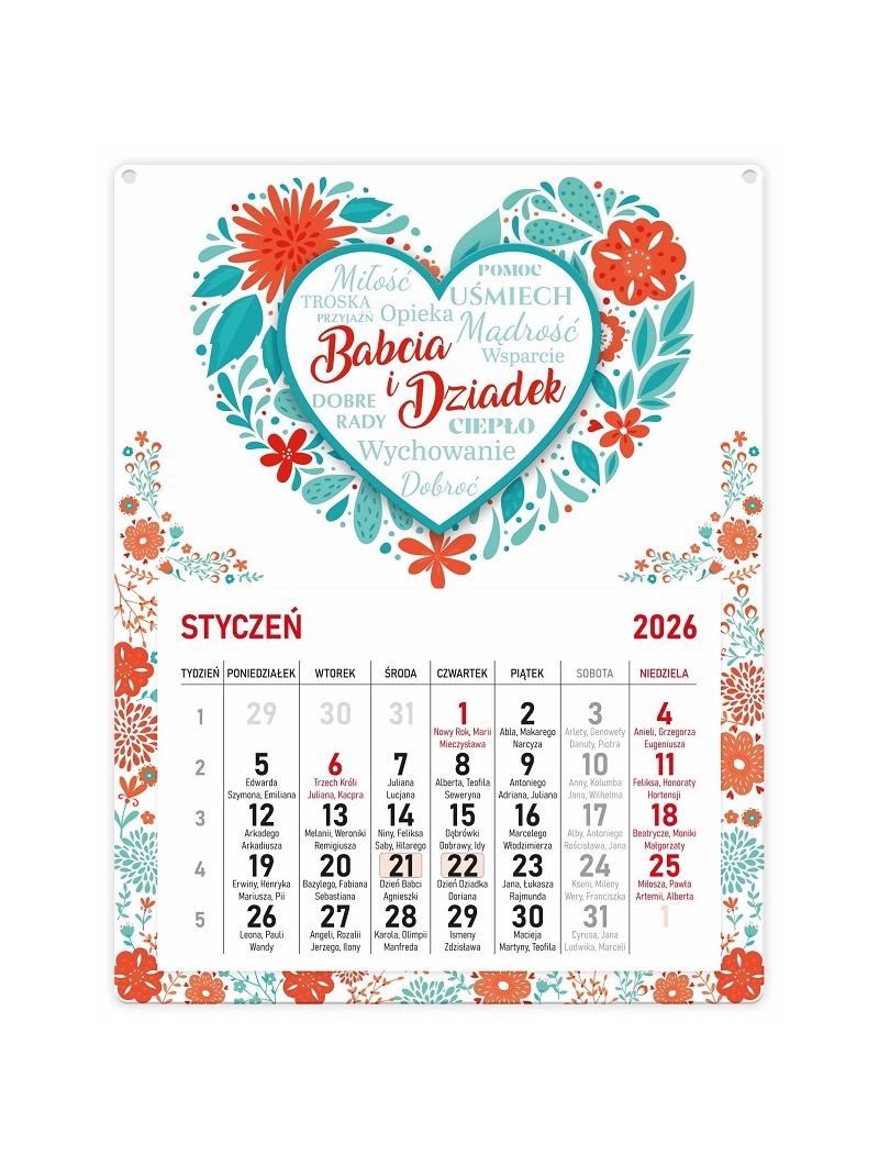 Kalendarz dla Babci i Dziadka to oryginalny prezent na święta lub super upominek na Dzień babci i Dzień Dziadka. Przywoła wspaniałe, wesołe chwile w pamięci a Babcia z Dziadkiem z pewnością docenią ten miły gest. Kalendarz wykonany ze sklejki 3mm z naklejonym kalendarium. Kalendarz do zawieszenia na jutowym sznurku przymocowanym do kalendarza. Kalendarium jednodzielne składa się z 12 stron po jednej na każdy miesiąc. W kalendarzu zaznaczone są dni świąteczne oraz imieniny. Kalendarz ozdobiony jest naklejonym dużym sercem. Na kalendarzu wygrawerowany jest napis - dedykacja dla Babci i Dziadka. Kalendarz zapakowany jest w przeźroczysty celofan zawiązany kolorowymi wstążeczkami.