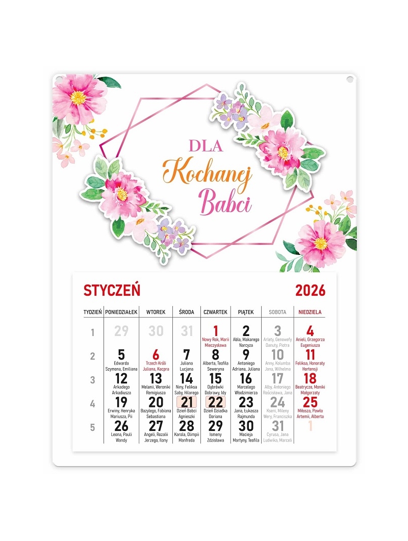 Kalendarz dla ukochanej Babci to pomysłowy prezent na święta lub super upominek na Dzień Babci. Kalendarz wykonany ze sklejki 3mm z naklejonym kalendarium. Kalendarz do zawieszenia na jutowym sznurku przymocowanym do kalendarza. Kalendarium jednodzielne składa się z 12 stron po jednej na każdy miesiąc. W kalendarzu zaznaczone są dni świąteczne oraz imieniny. Kalendarz ozdobiony jest naklejonym dużym kółkiem z nadrukiem. Na kalendarzu nadrukowany jest napis - "Najlepsza Babcia na świecie". Kalendarz zapakowany jest w przeźroczysty celofan zawiązany kolorowymi wstążeczkami.