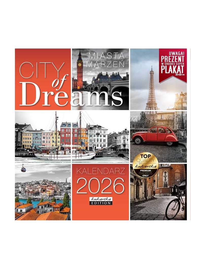 Kalendarz ścienny " CITY of Dreams" - "MIASTA MARZEŃ". Na każdy miesiąc jest zdjęcie innego miasta. W kalendarzu są zaznaczone święta oraz imieniny. Do kalendarza dołączony jest prezent w postaci plakatu o wymiarach 30,0cmx60,0cm.