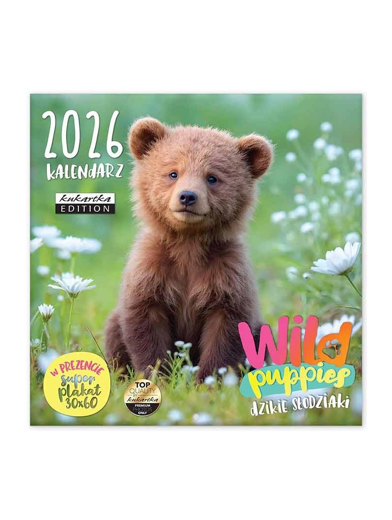 Kalendarz ścienny - "WILD puppies - dzikie słodziaki". Na każdy miesiąc jest zdjęcie innego dzikiego, słodkiego zwierzątka i napisane zabawne motto. W kalendarzu są zaznaczone święta oraz imieniny. Do kalendarza dołączony jest prezent w postaci plakatu o wymiarach 60,0cmx30,0cm.