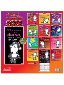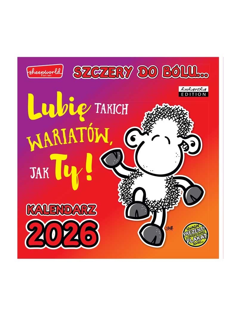 Kalendarz ścienny - "SZCZERY DO BÓLU". Na każdy miesiąc jest namalowany śmieszny rysunek z zabawną owieczka SHEEP i napisane zabawne motto. W kalendarzu są zaznaczone święta oraz imieniny. Do kalendarza dołączony jest prezent w postaci plakatu o wymiarach 60,0cmx30,0cm.