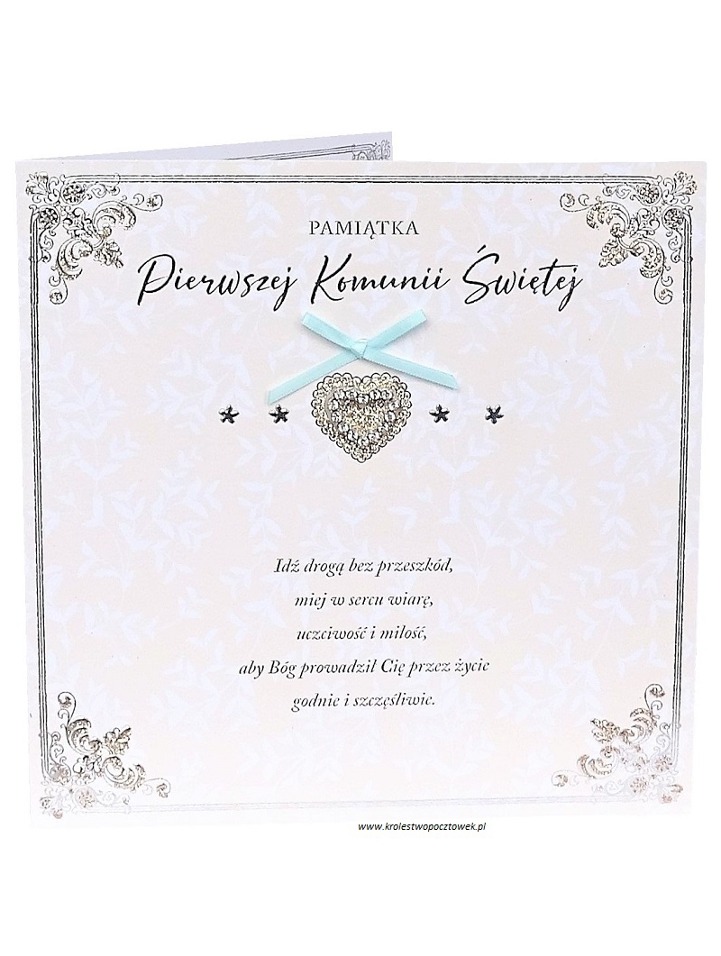 Pierwsza Komunia Święta to niezwykle ważne wydarzenie w życiu młodego chrześcijanina. Nasz karnet z napisanymi życzeniami może być miłą pamiątką z tej okazji. Elegancki karnet w kolorze kremowym ze srebrno złotymi zdobieniami.