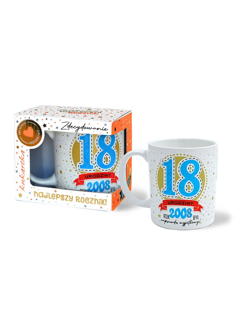Szukasz fajnego prezentu na 18 urodziny - my taki mamy. Kolorowy kubek PREMIUM z serii roczniki to doskonały prezent na taka okazję. Taki kubek to pożyteczny upominek a kawa czy herbata pita z tego kubka zawsze będzie przypominała osobę darczyńcy. Kubek wykonany z porcelany ozdobiony złotem. Na kubku namalowana jest duża, niebieska "18" , rok urodzin oraz opisane są najciekawsze wydarzenia z danego roku. Kubek zapakowany jest w ładny kartonik.