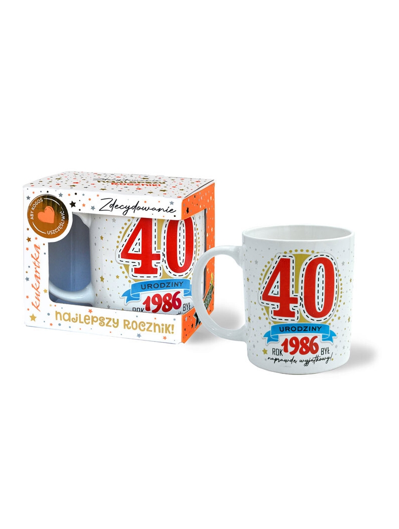 Szukasz fajnego prezentu na 40 urodziny - my taki mamy. Kolorowy kubek PREMIUM z serii roczniki to doskonały prezent na taka okazję. Taki kubek to pożyteczny upominek a kawa czy herbata pita z tego kubka zawsze będzie przypominała osobę darczyńcy. Kubek wykonany z porcelany ozdobiony złotem. Na kubku namalowana jest duża, czerwona "40", rok urodzin oraz opisane są najciekawsze wydarzenia z danego roku. Kubek zapakowany jest w ładny kartonik.