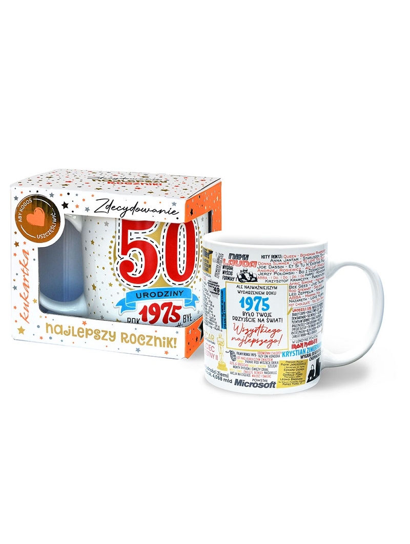 Szukasz fajnego prezentu na 50 urodziny - my taki mamy. Kolorowy kubek PREMIUM z serii roczniki to doskonały prezent na taka okazję. Taki kubek to pożyteczny upominek a kawa czy herbata pita z tego kubka zawsze będzie przypominała osobę darczyńcy. Kubek wykonany z porcelany ozdobiony złotem. Na kubku namalowana jest duża, czerwona "50", rok urodzin oraz opisane są najciekawsze wydarzenia z danego roku. Kubek zapakowany jest w ładny kartonik.