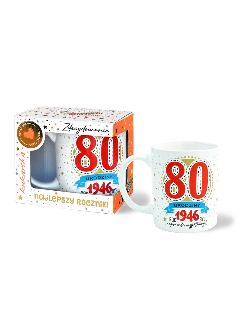 Szukasz fajnego prezentu na 80 urodziny - my taki mamy. Kolorowy kubek PREMIUM z serii roczniki to doskonały prezent na taka okazję. Taki kubek to pożyteczny upominek a kawa czy herbata pita z tego kubka zawsze będzie przypominała osobę darczyńcy. Kubek wykonany z porcelany ozdobiony złotem. Na kubku namalowana jest duża, czerwona "80", rok urodzin oraz opisane są najciekawsze wydarzenia z danego roku. Kubek zapakowany jest w ładny kartonik.