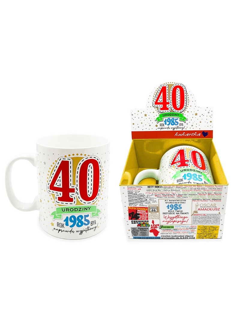 Szukasz fajnego prezentu na 40 urodziny - my taki mamy. Kolorowy kubek GIGANT z nowej serii roczniki to doskonały prezent na taką okazję. Taki kubek to pożyteczny upominek a kawa czy herbata pita z tego kubka zawsze będzie przypominała osobę darczyńcy. Kubek o dużej pojemności, która eliminuje konieczność częstego odrywania się od ciekawych zajęć celem uzupełnienia zawartości. Na kubku namalowana jest duża, czerwona "40", rok urodzin oraz opisane są najciekawsze wydarzenia z danego roku. Kubek wykonany z porcelany zapakowany jest w ładny kartonik.