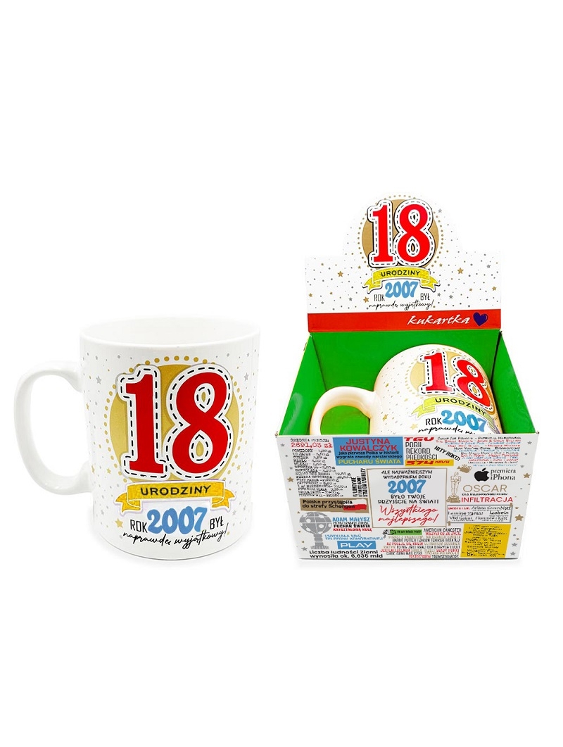 Szukasz fajnego prezentu na 18 urodziny - my taki mamy. Kolorowy kubek Gigant z nowej serii roczniki to doskonały prezent na taka okazję. Taki kubek to pożyteczny upominek a kawa czy herbata pita z tego kubka zawsze będzie przypominała osobę darczyńcy. Kubek o dużej pojemności, która eliminuje konieczność częstego odrywania się od ciekawych zajęć celem uzupełnienia zawartości. Na kubku namalowana jest duża, czerwona "18", rok urodzin oraz opisane są najciekawsze wydarzenia z danego roku. Kubek wykonany z porcelany zapakowany jest w ładny kartonik.