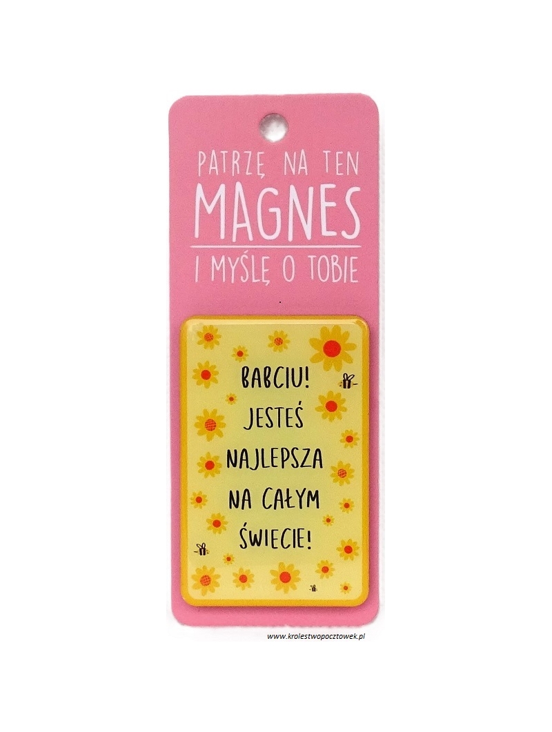 Chcesz zrobić Babci miłą niespodziankę - kup Jej magnes z przesłaniem "PATRZĘ NA TEN MAGNES I MYŚLĘ O TOBIE". Kolorowy, prostokątny magnes z napisem "BABCIU! JESTEŚ NAJLEPSZA NA CAŁYM ŚWIECIE" na pewno ładnie ozdobi Jej lodówkę oraz ucieszy Babcię. Kolorowy magnes przymocowany jest do ładnego kartonika i idealnie nadaje się na drobny prezent dla każdego np. z okazji urodzin, imienin czy Mikołaja.