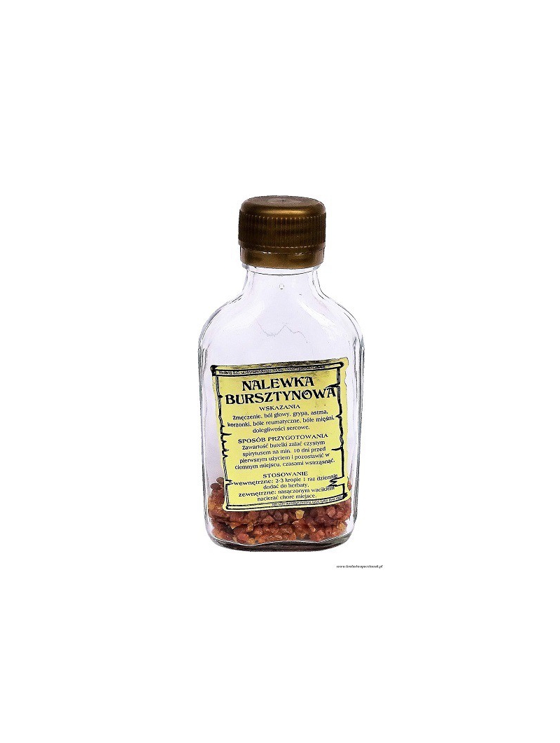 Buteleczka wypełniona kruszonym bursztynem przeznaczonym na nalewkę. Na buteleczce naklejona jest naklejka z przepisem na przygotowanie bursztynowej nalewki. Bursztyn używany jest w medycynie naturalnej, w postaci nalewki bursztynowej. Taka buteleczka będzie ładną pamiątką z wakacji nad morzem lub miłym upominkiem.