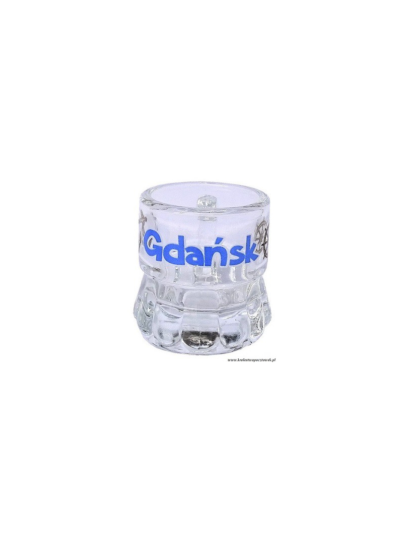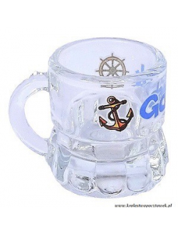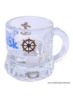 Kieliszek szklany w kształcie kufelka ozdobiony nadrukiem - napisem "Gdańsk". Z jednej strony napisu Gdańsk jest naklejona kotwica z drugiej koło sterowe. Taki kufelek to będzie miła pamiątka szczególnie dla kolekcjonera kufli.