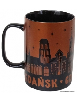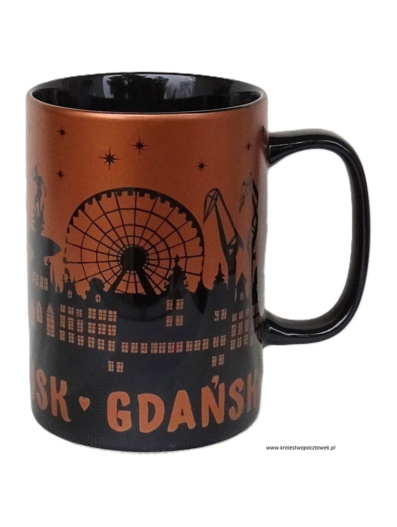 Wyjątkowy ceramiczny kubek z kolekcji "I LOVE POLAND". Kubek w kolorze: czarno-złotym z zewnątrz i czarnym w środku. Z zewnątrz kubek ozdobiony jest grafikami przedstawiającymi zabytki Gdańska. Duży pojemny kubek z wygodnym uchwytem świetnie nadaję się na pamiątkę z wakacji lub jako upominek.