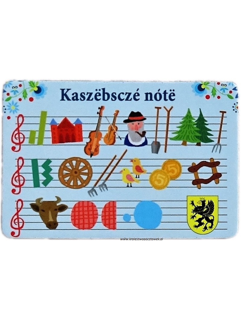 Magnes ze wzorem kaszubskich nut, popularną kaszubską wyliczanką. Kolekcjonujesz magnesy z różnych regionów Polski? Ten magnes musisz mieć w swojej kolekcji. Ludowy magnes jest też dobrym pomysłem na drobny prezent z Polski, nawiązujący do naszego pięknego polskiego folkloru.
