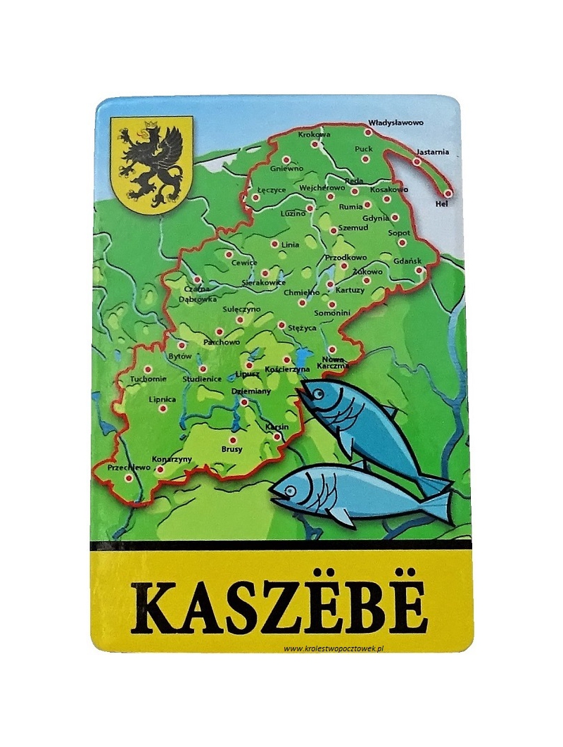 Magnes z mapą Kaszub i napisem KASZËBË. Kolekcjonujesz magnesy z różnych regionów Polski? Ten magnes musisz mieć w swojej kolekcji. Taki magnes jest też dobrym pomysłem na drobny prezent z Polski, nawiązujący do naszego pięknego polskiego folkloru.