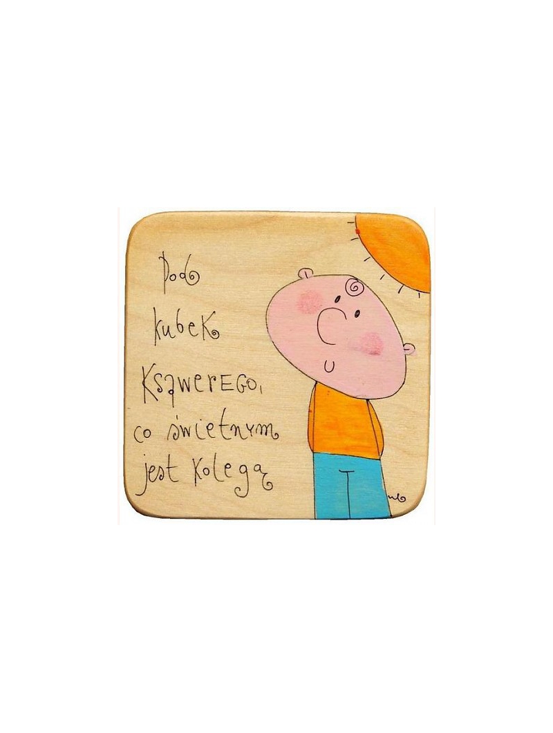 Oryginalna, ręcznie wykonana podkładka pod kubek. Idealna rzecz na prezent na różne okazje. Podkładki wykonane są z cienkiej sklejki podklejonej od spodu korkiem. Z wierzchu jest ręcznie namalowany śmieszny rysunek i napis. Całość zabezpieczona poprzez lakierowanie. Rysunek na otrzymanej podkładce może nieznacznie różnić się od tego widocznego na zdjęciu (podkładki są ręcznie malowane i przez to niepowtarzalne).