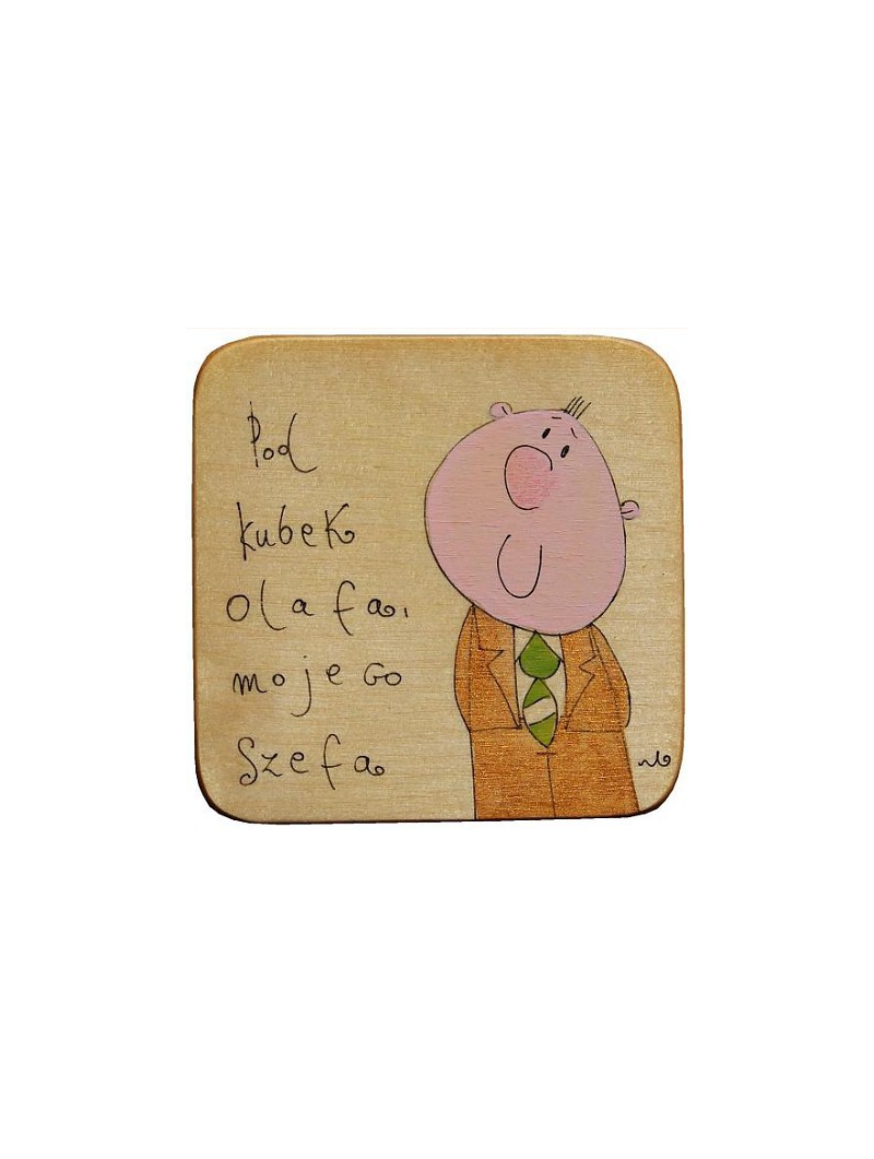 Oryginalna, ręcznie wykonana podkładka pod kubek. Idealna rzecz na prezent na różne okazje. Podkładki wykonane są z cienkiej sklejki podklejonej od spodu korkiem. Z wierzchu jest ręcznie namalowany śmieszny rysunek i napis. Całość zabezpieczona poprzez lakierowanie. Rysunek na otrzymanej podkładce może nieznacznie różnić się od tego widocznego na zdjęciu (podkładki są ręcznie malowane i przez to niepowtarzalne).