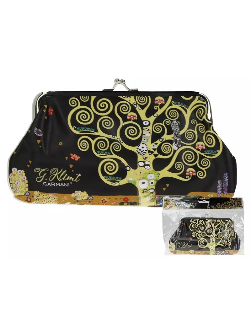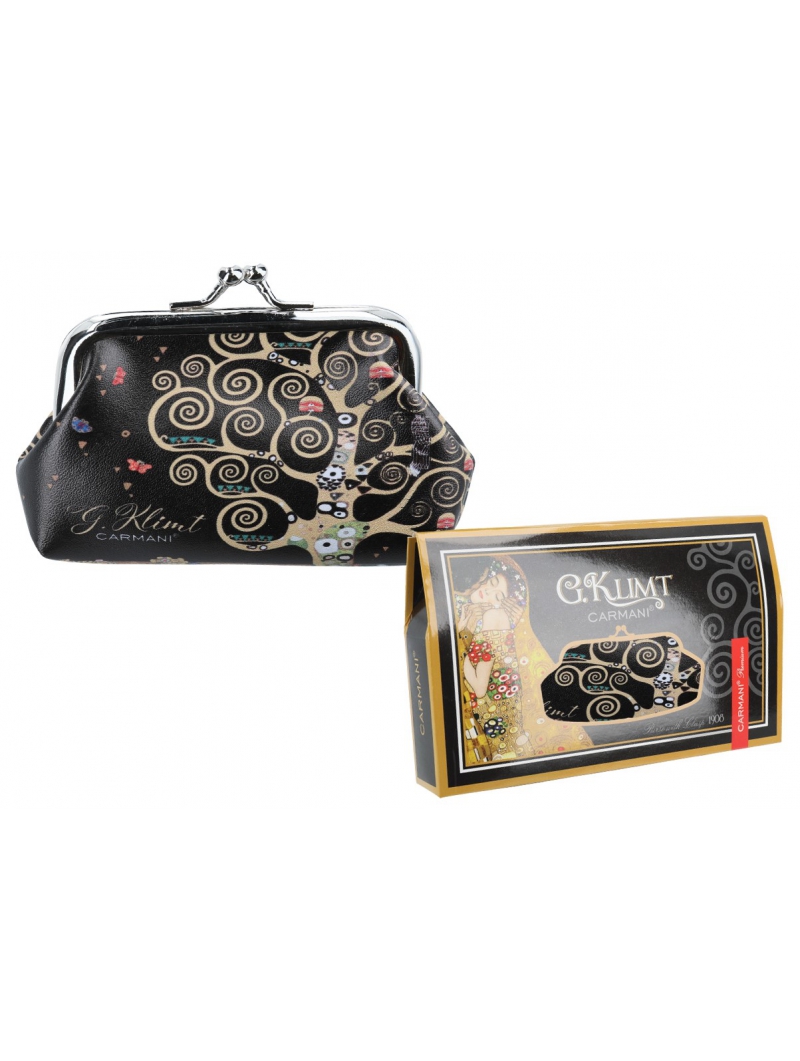 Jeśli szukasz portmonetki w której mieszczą monety i banknoty - ta będzie odpowiednia. Można ją także wykorzystać do dyskretnego przechowywania damskich skarbów. Portmonetka z kolekcji CARMANI ozdobiona jest motywem z obrazu "Drzewo życia" Gustava Klimta. Portmonetka zamykana jest na bigiel. Taka portmonetka przyda się każdej kobiecie lubiącej małe torebeczki.