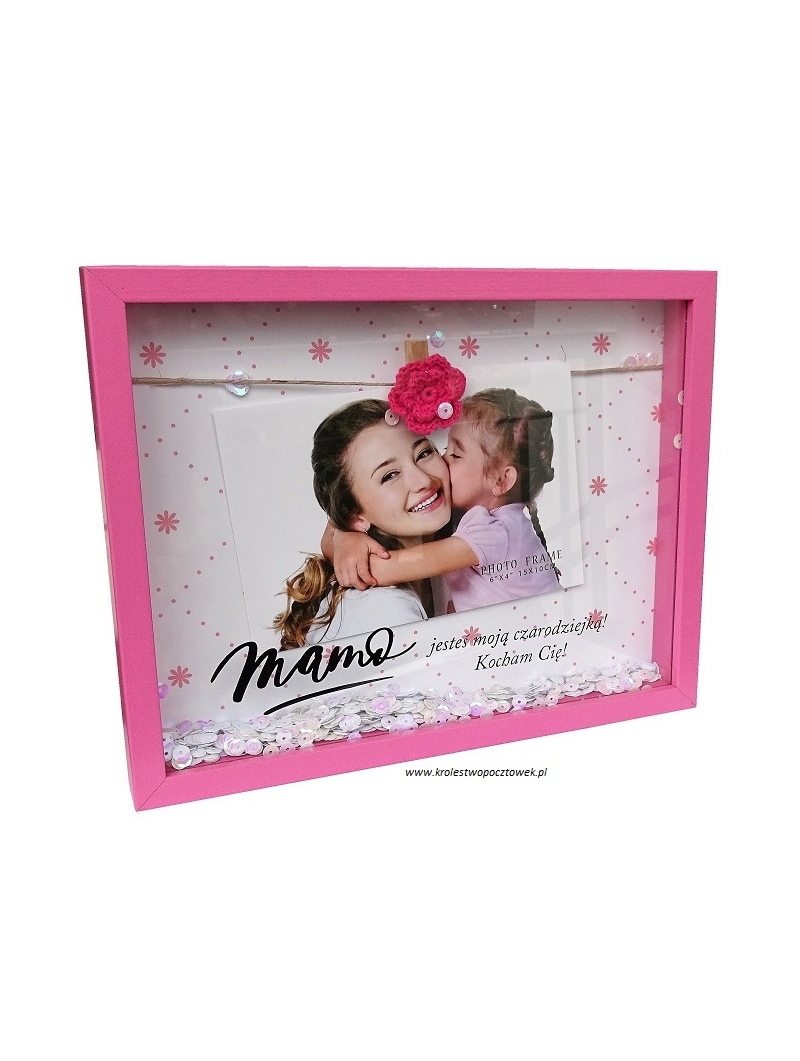 W tej ładnej ramce Box w kolorze różowym Mama może umieścić najpiękniejsze rodzinne fotografie, obrazy czy inne grafiki. Ramka wykonana z MDF jest wytrzymała i trwała, dlatego z pewnością długo będzie zdobić mieszkanie. W różowej oprawie pięknie będą wyeksponowane zdjęcia z ważnych wydarzeń w życiu. Zdjęcie w ramce umocowane jest na sznureczku za pomocą ozdobnej klamerki. Dodatkową ozdoba ramki są wrzucone do niej mieniące się białe cekiny. Ta kolorowa ramka ramka może zostać tylko postawiona w sypialni czy pokoju dziennym. Ramka z dedykacją dla Mamy będzie ładnym prezentem na Dzień Mamy i nie tylko z tej okazji. Ramka typu Box mieści zdjęcie o wymiarach 10,0cmx15,0cm. Ramka zapakowana jest w ładny kartonik.