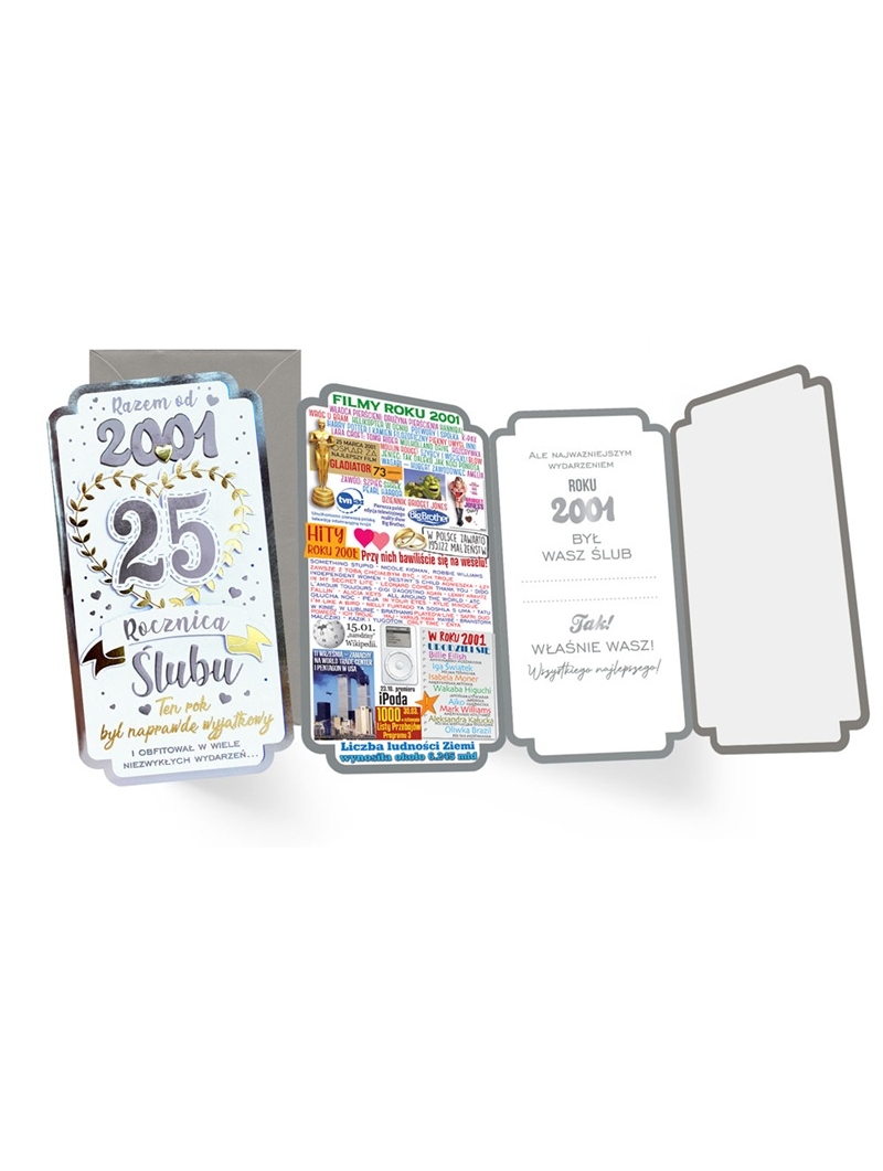 Kartka z serii "Roczniki" to ciekawa opcja karnetu wysyłanego z okazji "okrągłych" rocznic. Karnet z życzeniami z okazji "25 Rocznicy Ślubu" z naklejoną na piance dystansowej dużą srebrną 25. Tematyka kartek z reguły zabarwiona szczyptą humoru nawiązuje do wydarzeń sprzed 25 lat - w 2001 roku.
