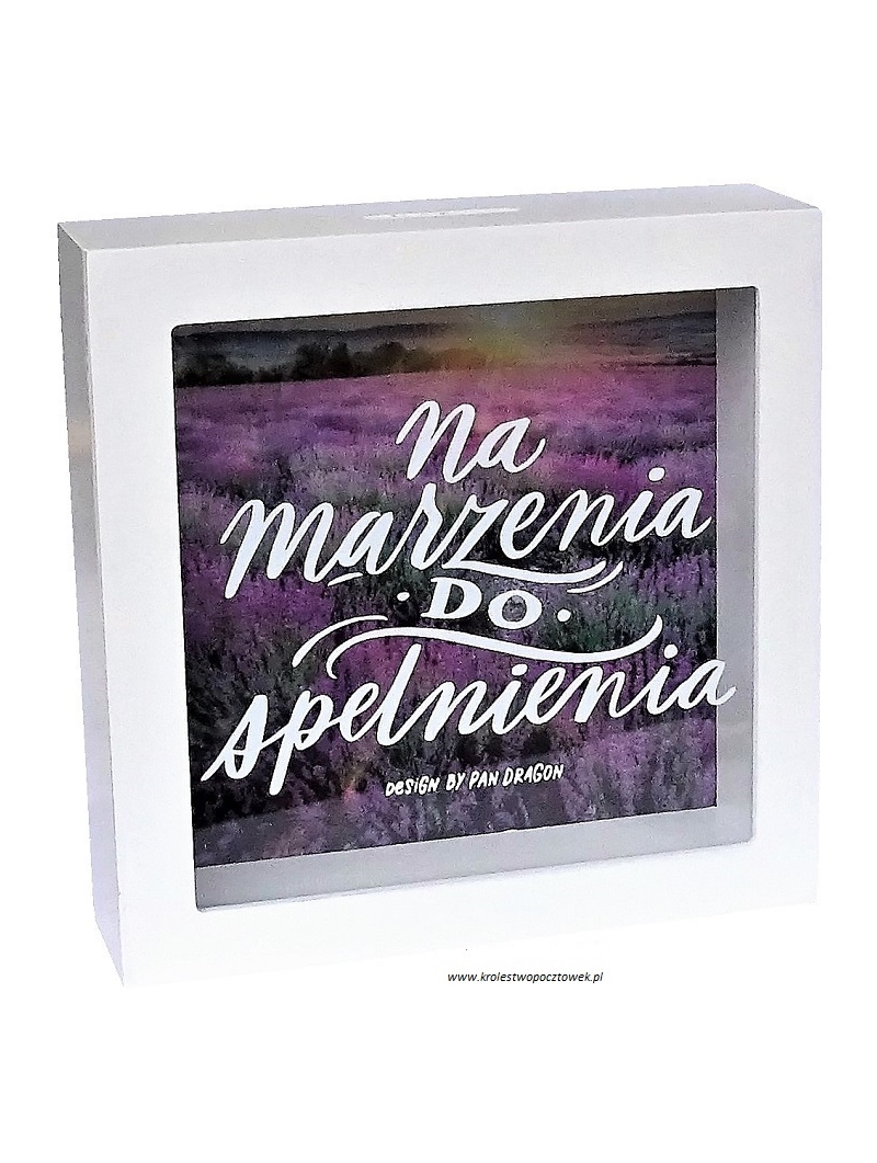 Skarbonka – pojemnik służący do zbierania i przechowywania pieniędzy. Zwykle skarbonki używane są do oszczędzania, by można było zgromadzić większą kwotę, a później wydać ją na zamierzony cel. Elegancka skarbonka z kolekcji "HOME" to idealny sposób na zebranie potrzebnej kwoty na wymarzony cel. Cel, na który maja być zbierane pieniądze napisany jest na przedniej ściance skarbonki. Tylna ścianka skarbonki jest otwierana dlatego po wypełnieniu jej możemy spokojnie wyjąć wszystkie uzbierane pieniądze nie niszcząc skarbonki i zacząć zbierać na nowo. Kup sobie lub podaruj komuś taką skarbonkę i zachęć go do oszczędzania na małe i duże przyjemności. Skarbonka w kształcie prostopadłościanu wykonana jest z pomalowanej na biało płyty mdf. Przednia ścianka skarbonki zrobiona jest z przezroczystego tworzywa dlatego widać stopień zapełnienia skarbonki. Na skarbonce znajduje się napis - "Na marzenia DO spełnienia".