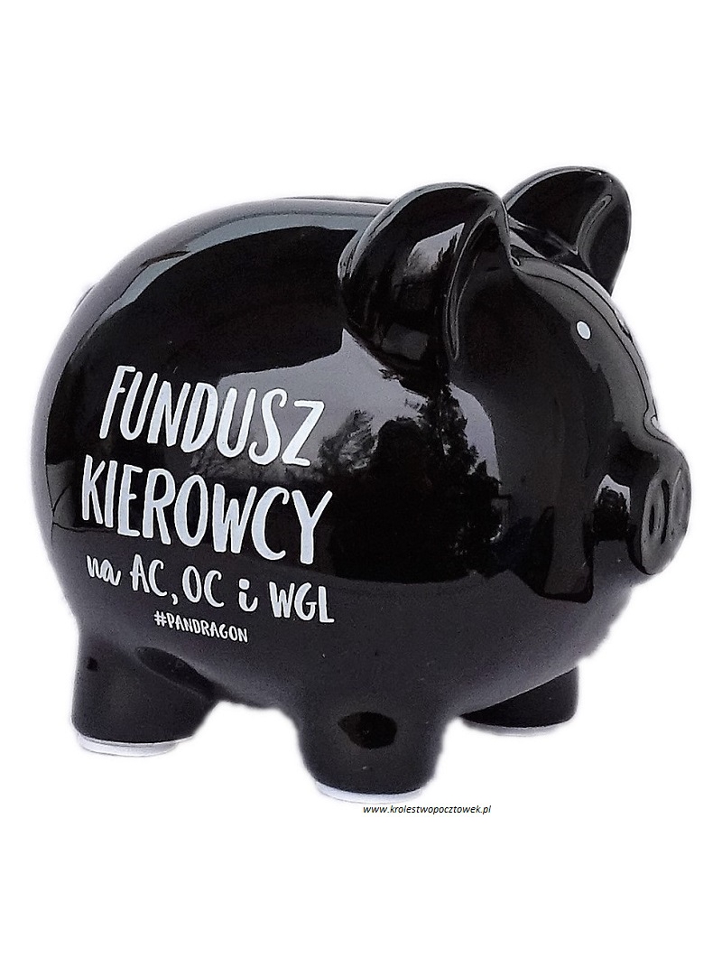Marzenia są po to, aby je spełniać. Najlepiej jednak najpierw na nie uzbierać. Nie ma mowy o podbieraniu drobniaków na przysłowiową chwilę. Ta skarbonka to lokata długoterminowa, gdyż aby dobrać się do kasy trzeba ją rozbić. Skarbonka wykonana jest z ceramiki w kolorze: czarnym i zapakowana jest w ładne kartonowe pudełko. Nasza skarbonka świnka najlepiej przyciągnie przyszłych darczyńców namalowanym na niej napisem: "FUNDUSZ KIEROWCY na AC,OC i WGL".