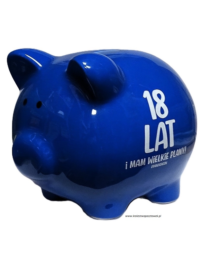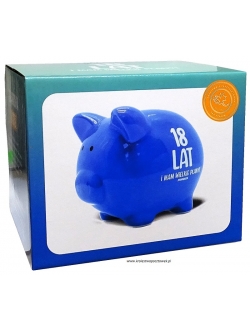 Skarbonka świnka w kolorze niebieskim z białym napisem "18 LAT i MAM WIELKIE PLANY". Ładnie wykonany prezent na 18 urodziny, pozwalający zaoszczędzić trochę pieniędzy na wymarzoną nową zabawkę lub przedmiot. Skarbonka świnka przyjmuje wszystkie nominały. Ta skarbonka to lokata długoterminowa, gdyż aby dobrać się do kasy trzeba ją rozbić. Skarbonka wykonana z ceramiki i zapakowana jest w ładne kartonowe pudełko.