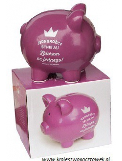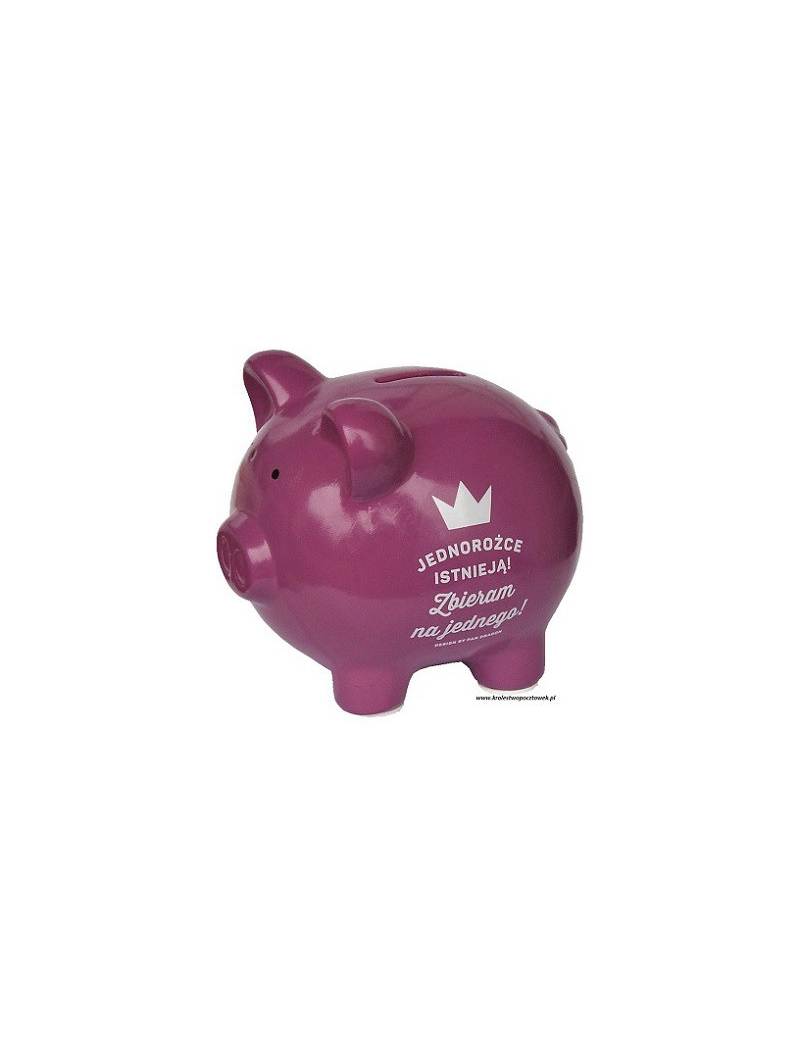 Skarbonka świnka w kolorze ciemno różowym z białym napisem "JEDNOROŻCE ISTNIEJĄ! Zbieram na jednego!". Ładnie wykonany prezent dla dziewczynki lub kobiety, pozwalający zaoszczędzić trochę pieniędzy na wymarzoną nową zabawkę, sukienkę lub nowe buty. Skarbonka świnka przyjmuje wszystkie nominały. Ta skarbonka to lokata długoterminowa, gdyż aby dobrać się do kasy trzeba ją rozbić. Skarbonka wykonana z ceramiki i zapakowana jest w ładne kartonowe pudełko.