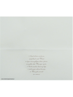 W Dniu Ślubu warto podarować nowożeńcom szczególną pamiątkę. Elegancki karnet, który proponujemy pomoże pamiętać im każdego dnia o miłości, którą przyrzekli sobie w tym szczególnym Dniu. Karnet wykonany jest z papieru w kolorze kremowym. Na ozdobnej opasce karnetu naklejona jest satynowa kremowa kokarda. W środku napisane są życzenia.