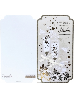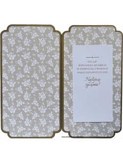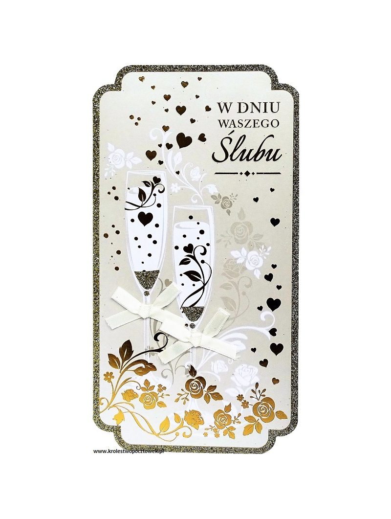 W Dniu Ślubu warto podarować nowożeńcom pamiątkę, która pomoże pamiętać im o miłości, którą przyrzekli sobie w tym szczególnym Dniu. Ozdobnie wycięty karnet dodatkowo zdobiony jest złotym brokatem. W środku napisane są życzenia.