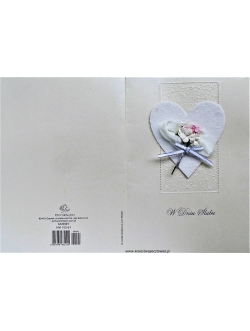 W Dniu Ślubu warto podarować nowożeńcom pamiątkę, która pomoże pamiętać im o miłości, którą przyrzekli sobie w tym szczególnym Dniu. Karnet wykonany z papieru w kolorze kremowo - perłowym. Na pierwszej stronie karnetu naklejone jest duże białe serce ozdobione kolorowymi kwiatkami. W środku napisane są życzenia.